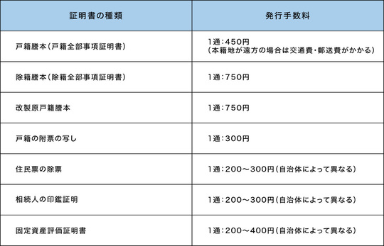 相続登記では、さまざまな証明書が必要となります。各証明書とその金額を表にしたので、こちらを参考にしてください。